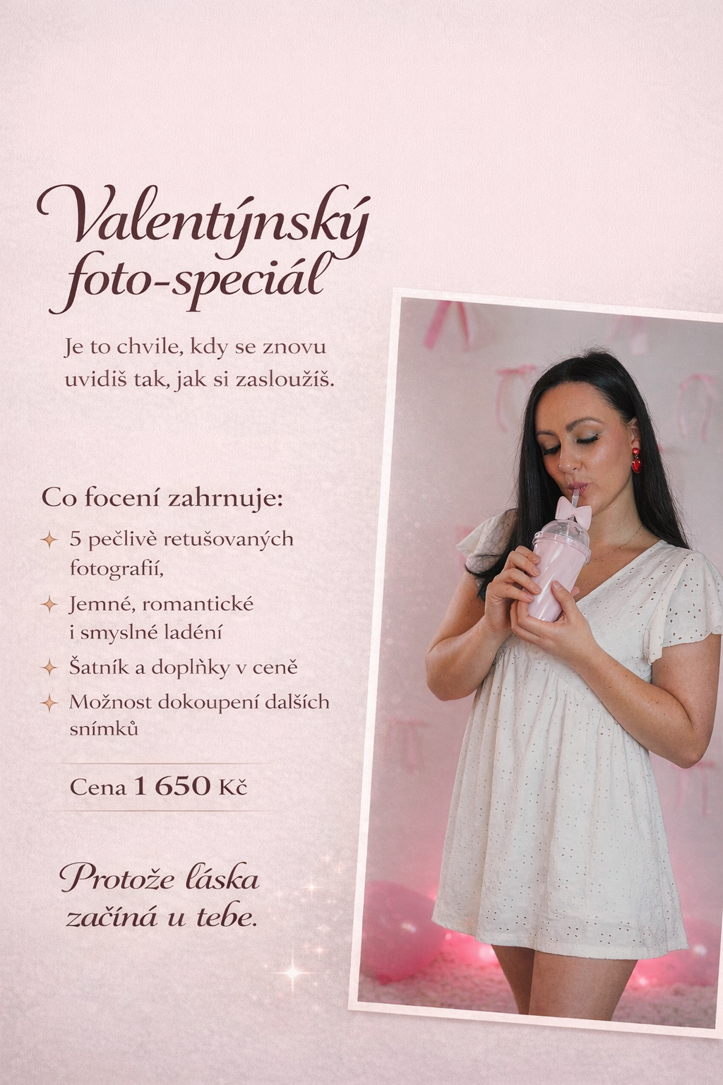 - U každého focení budou připraveny čerstvé, sladké rekvizity, které si samozřejmě můžeš vzít jak na fotku, tak v klidu sníst/donést domů. :) K dispozici budou např. jahodové cupcaky, srdíčková lízátka, jahodový či třešňový koktejl se šlehačkou, případně nealko šampáňo.